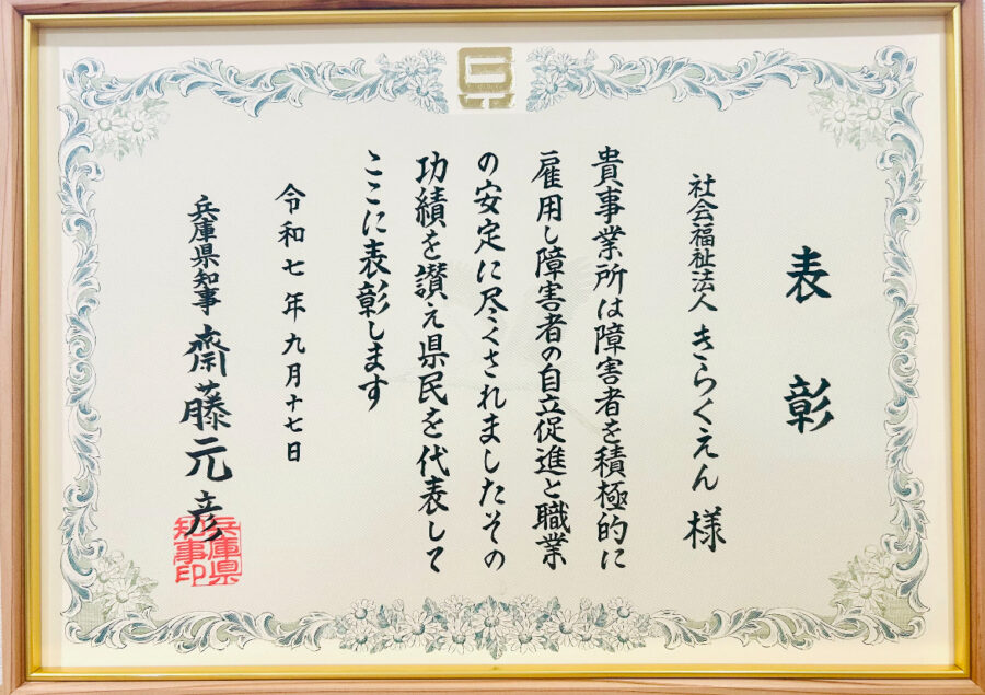 このたび、きらくえんが 障害者の雇用促進等について率先して取り組んでいる事業所としての功績を讃えられ兵庫県知事表彰を受賞しました。