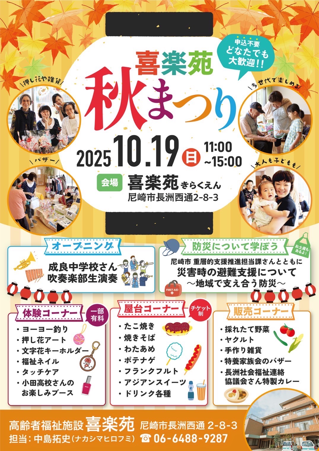 2025年10月19日(日)11:00~15:00、喜楽苑 秋まつりが開催されます。