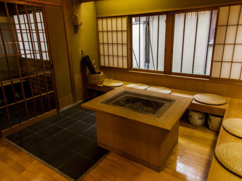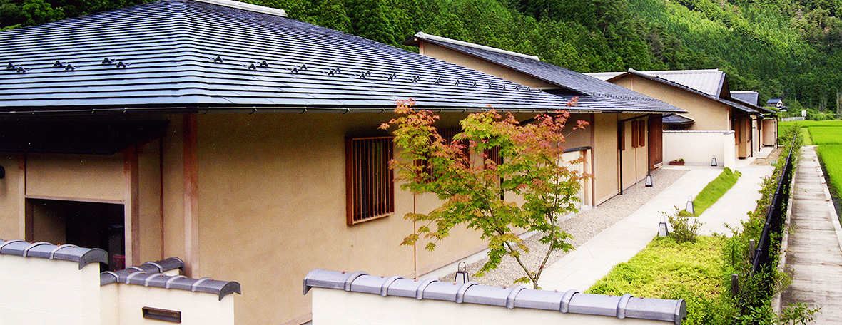 いくの喜楽苑は、1992年9月に兵庫県朝来市で開設されました。山や田んぼに囲まれた平屋造りの建物の横には川が流れ、どこにいても周囲の緑を望むことができます。冬になれば石州瓦で葺いた屋根に雪が積もり、宿のような風情もあります。