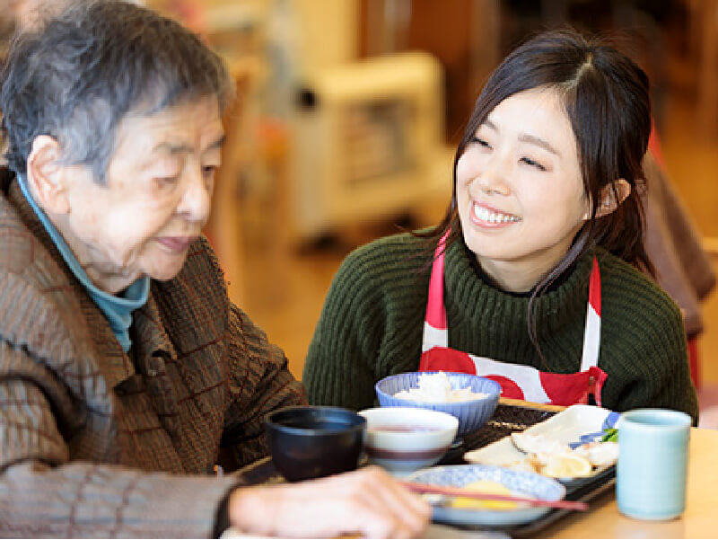ご利用者それぞれの身体の状況、栄養の状況に応じて、食生活のアドバイスや栄養の指導などを行います。栄養バランスのとれた献立の立案や「きざみ食」「とろみ食」といった食事形態の調整など、食事を通して、ご利用者が健康に過ごせるようにサポートします。